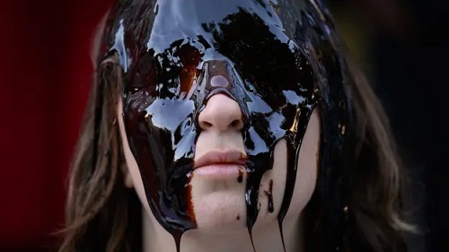 Con la cara cubierta una sustancia aceitosa, una activista del grupo de acción directa Fossil Free London se ubicó frente a las oficinas de la compañía energética Shell en mayo pasado.